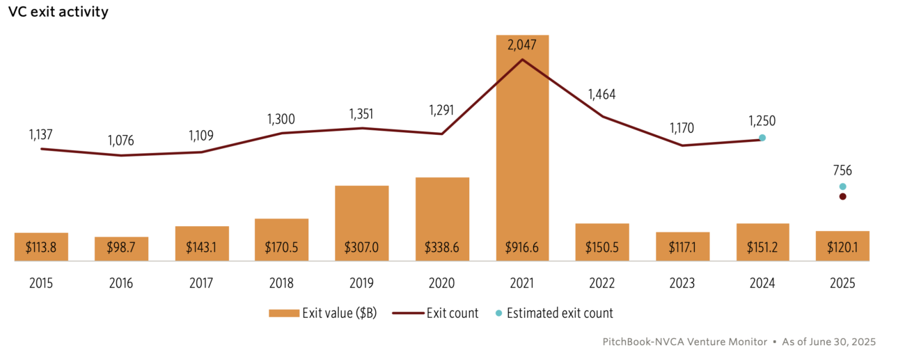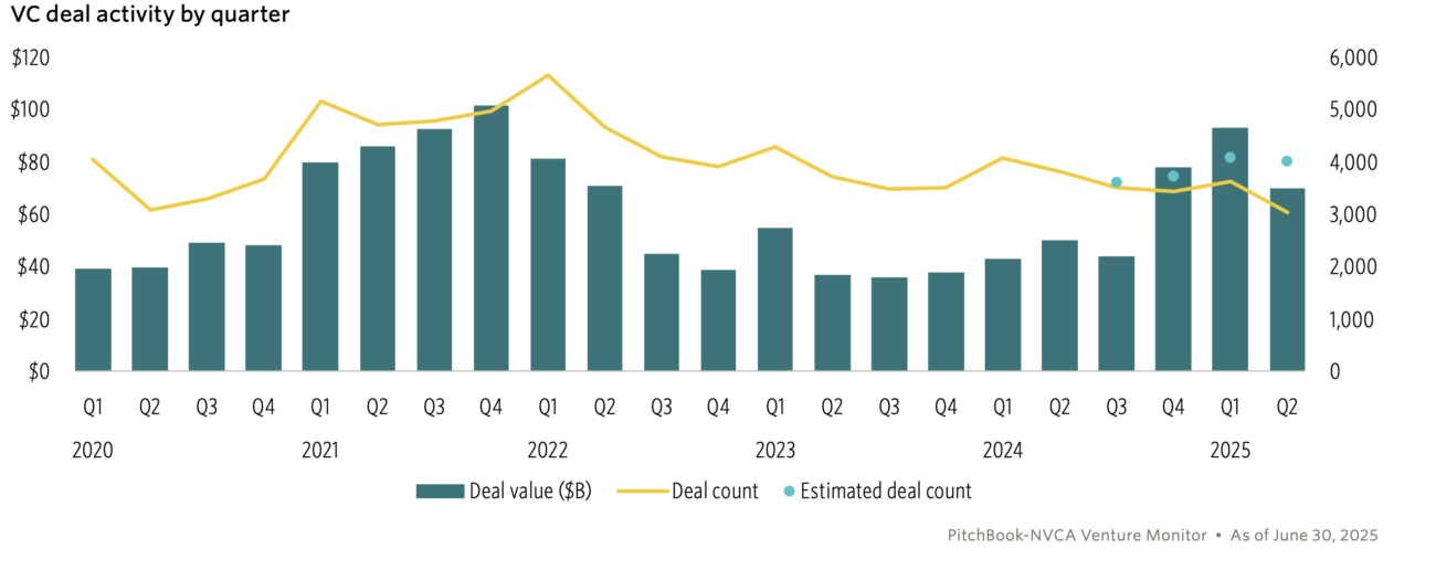 This flywheel, unfortunately, has been slowed down over the last few years. Many of the high number of companies that managed to raise money in the zero interest rate era and often a inflated valuation now serve as a cautionary tale for the industry. And cautious they’ve become. While the dollar amount of VC deals has begun climbing again in the last few quarters, an interesting pattern is emerging. The number of deals seems to be continuing to drop from the peaks of 2021 while the dollar amounts are climbing again after a few years of dropping from the 2021 highs. This means that fewer companies are receiving funding, larger checks are going to the winners, and the rising deal value is being driven by some outsized rounds for the likes of OpenAI. So, the total dollar amount invested is misleading in describing what’s really going on in the VC funding space. As a matter of fact, Q2 2025 saw one of the lowest deal count totals in years for early-stage technology firms. Part of the explanation for all of this is that the VCs need to achieve some exits for their portfolio companies and are cutting back on early stage investing to give money to later stage deals that can get to an exit in a shorter time frame so they can distribute capital back to their LPs. Also, in a risk-off environment where they can’t afford more companies sitting in their NAVs with no path to an exit, they would rather write larger checks to safer bets.